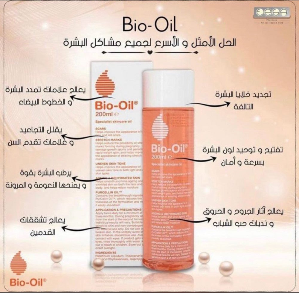 بيو اويل تقدم هذا الزيت الذي يقدم عناية للبشرة و يعمل على حل مشاكلها ، يعمل على تحسين مظهر الجلد يوجه عام ، يعمل على علاج البثور و الندبات بكل فاعلية ، يساعد في توحيد لون البشرة ، يمنح البشرة الجافة نعومة و ترطيب ، يساعد على حفظ الرطوبة في الجلد ، مناسب لكل أنواع البشرة ، متوفر بحجم 200 مل
