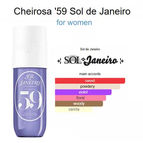 عطر عالمى وعصرى بالفانيليا. عطر حديث. تم إطلاق تشيروسا ’59 في عام 2024. الطبقة العليا: البرقوق العنبر الأسود، كريم دي كاسيس. أما الوسط: أزهار الياسمين، الأوركيد البرازيلي, أما مكونات قاعدة البرفيوم ميست: أخشاب الفانيليا، المسك الدافئ. Sol De Janeiro CHEIROSA 59 DELlCIA DRENCH PERFUME MIST 90ml.