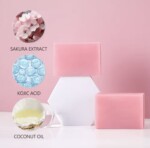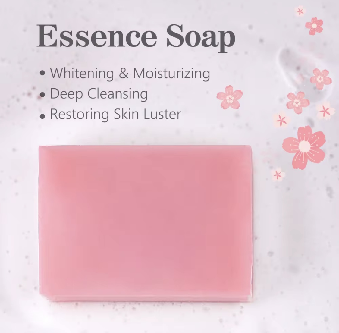 تظهر قطعة من صابون “Essence Soap” باللون الوردي. يُعرف هذا النوع من الصابون بخصائصه في تفتيح البشرة وترطيبها.